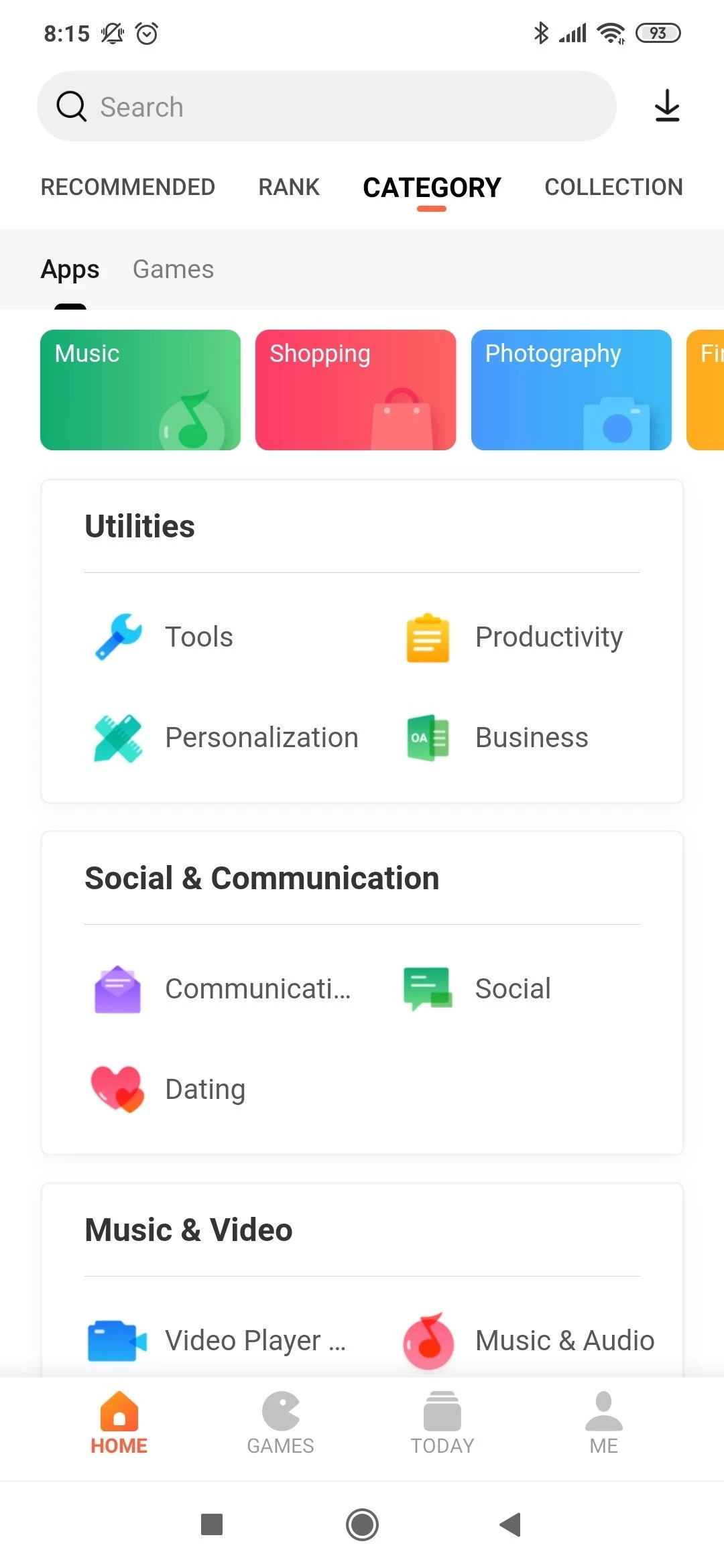 On completing the installation process, launch the app and log in to your account. The main page with a stylish UI attracts you and is categorized such as communication, photography, video games, and so on. Every category is including with plethora of apps that are arranged according to their popularity.